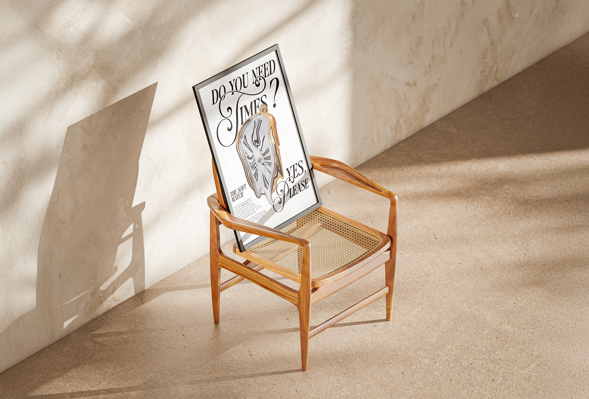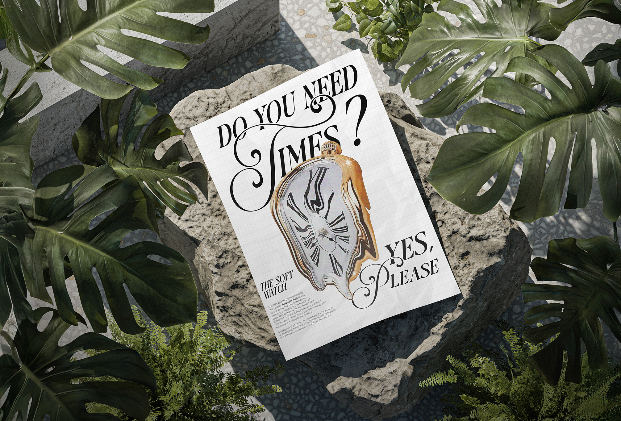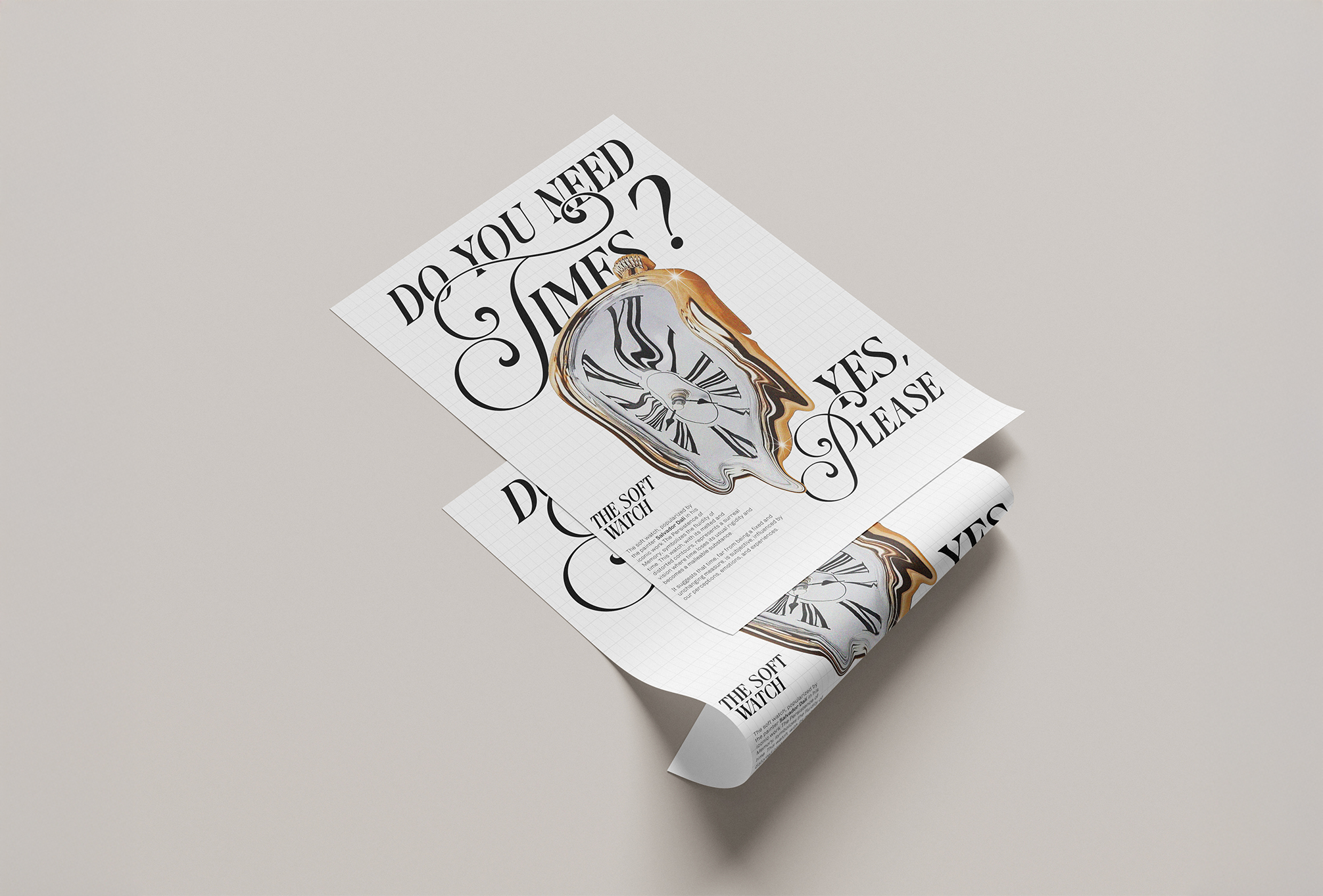 L'objectif principal de ce projet était de créer une affiche captivante mettant en avant l'iconique horloge fondue de Salvador Dalí. L'enjeu était de refléter la fluidité du temps à travers un design inspiré du surréalisme, avec des détails déformés sublimés par une typographie unique et onirique.