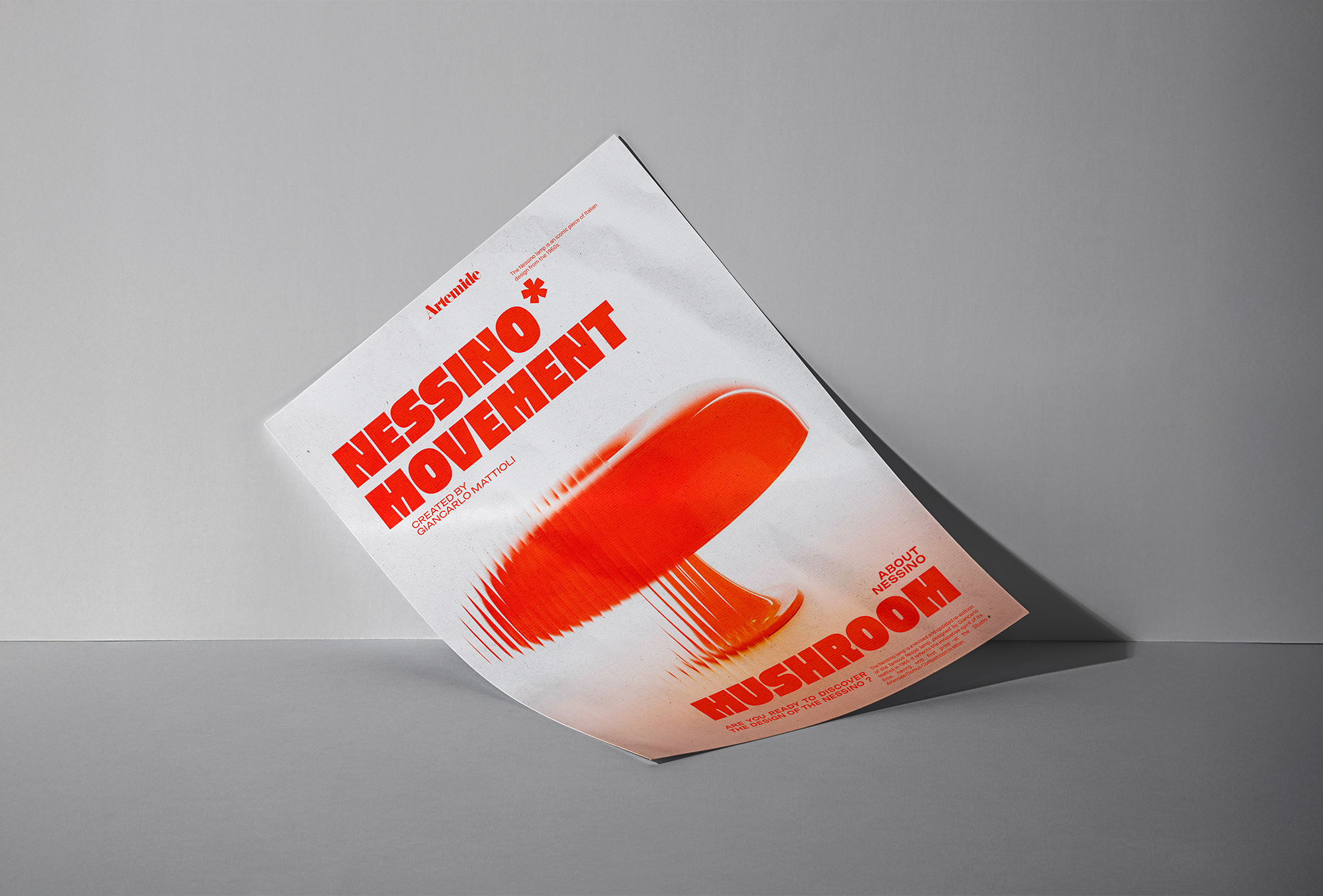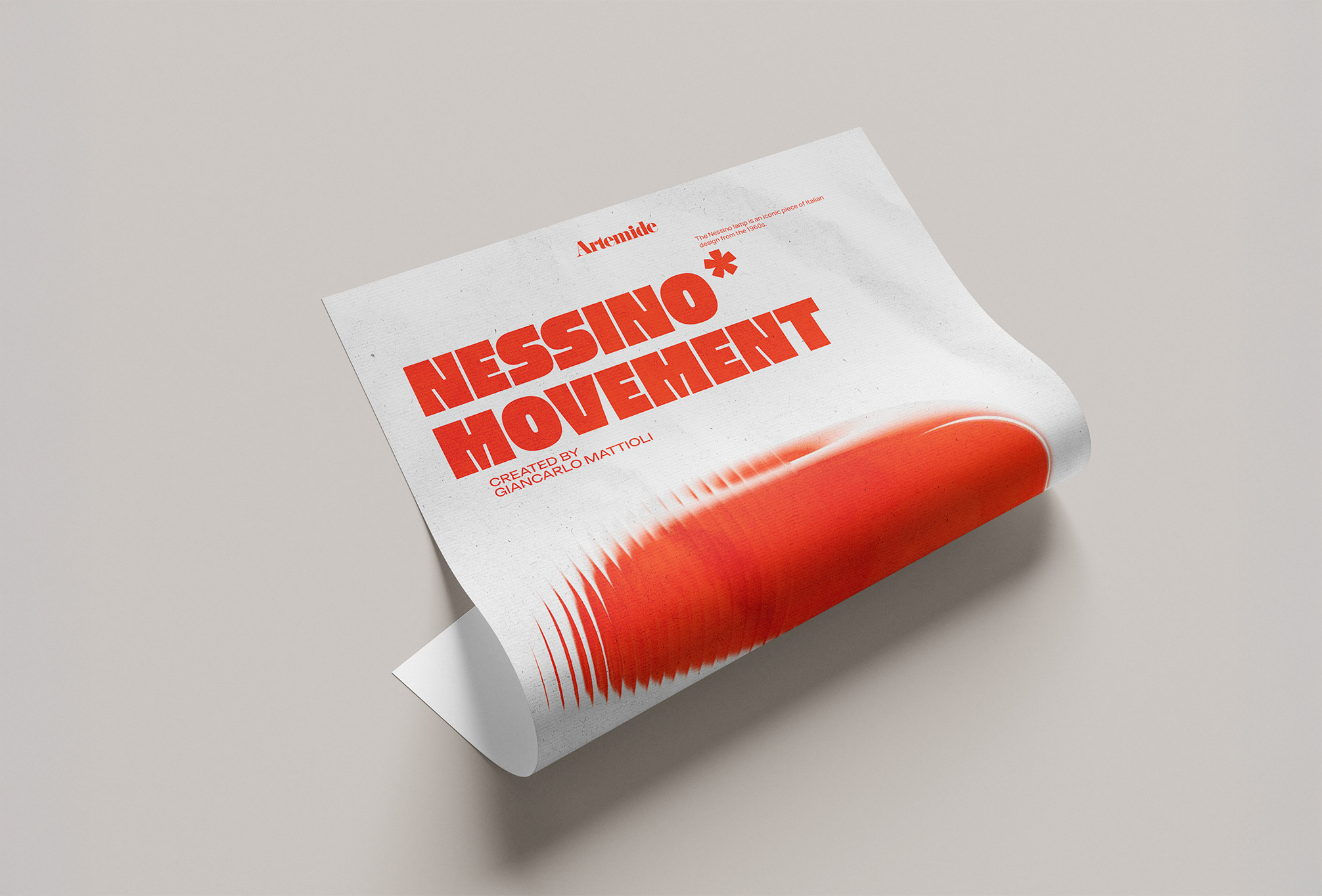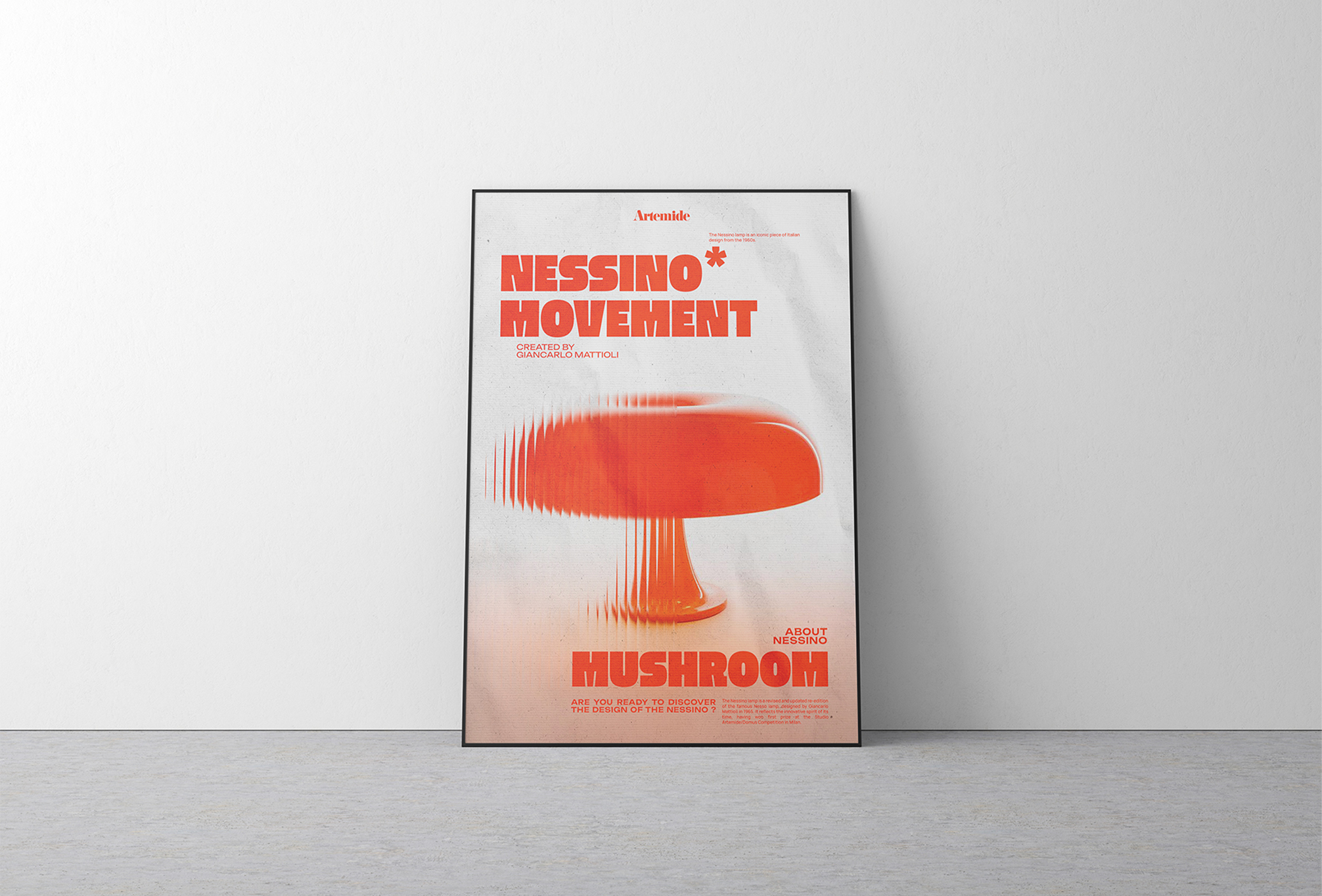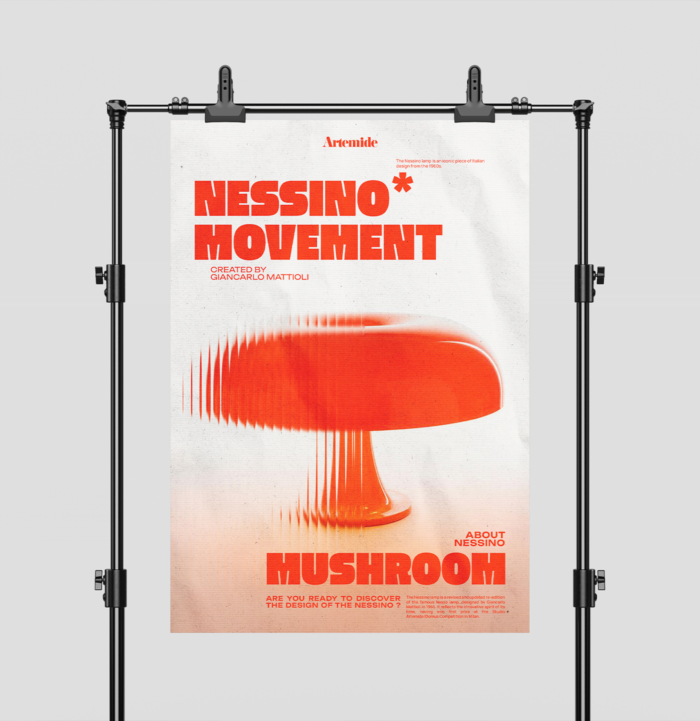 L'objectif principal de ce projet était de créer une affiche moderne pour sublimer la lampe rétro-futuriste Nessino des années 70. L'enjeu était de mettre en avant ses courbes distinctives et sa couleur vibrante, tout en utilisant des éléments graphiques tels qu'un effet "glass" pour renforcer son allure iconique.