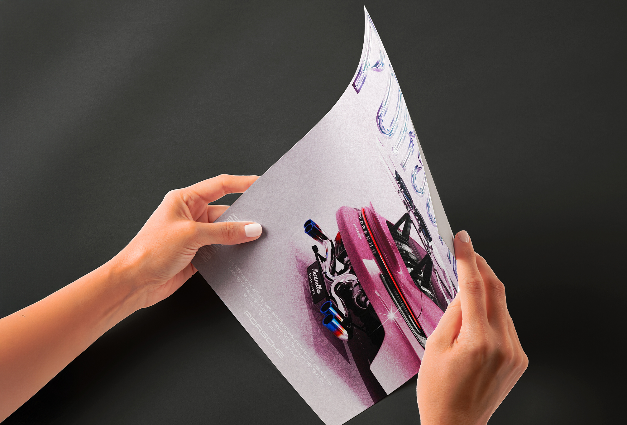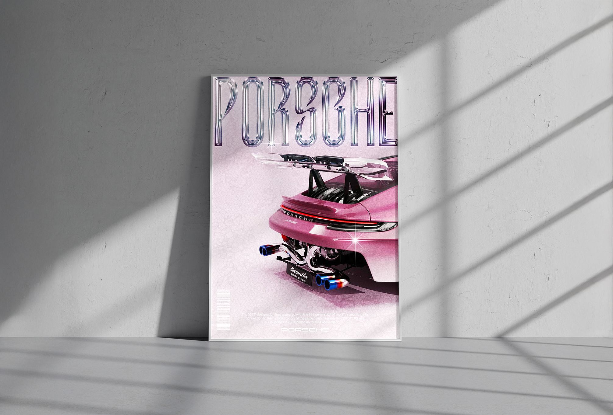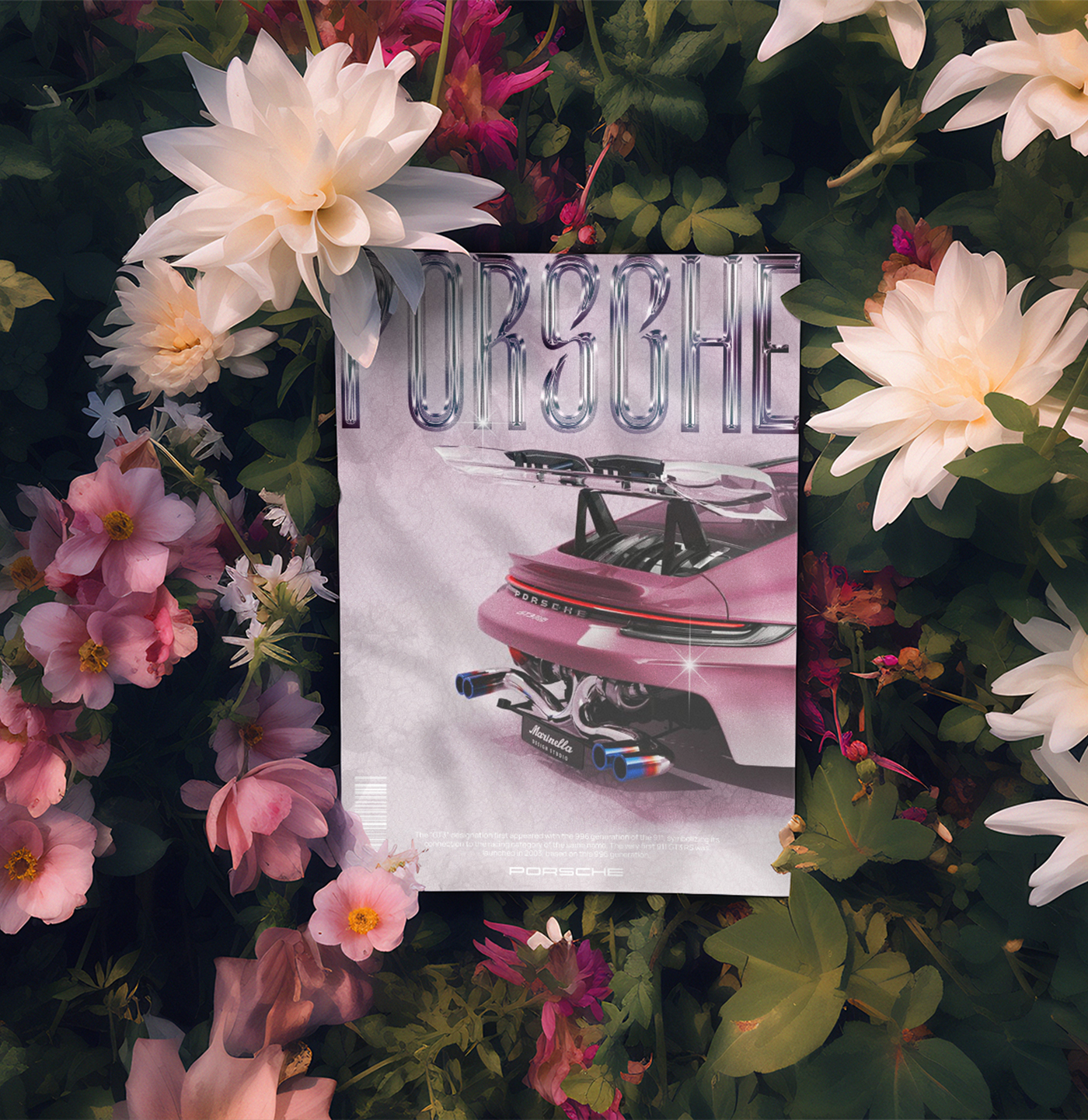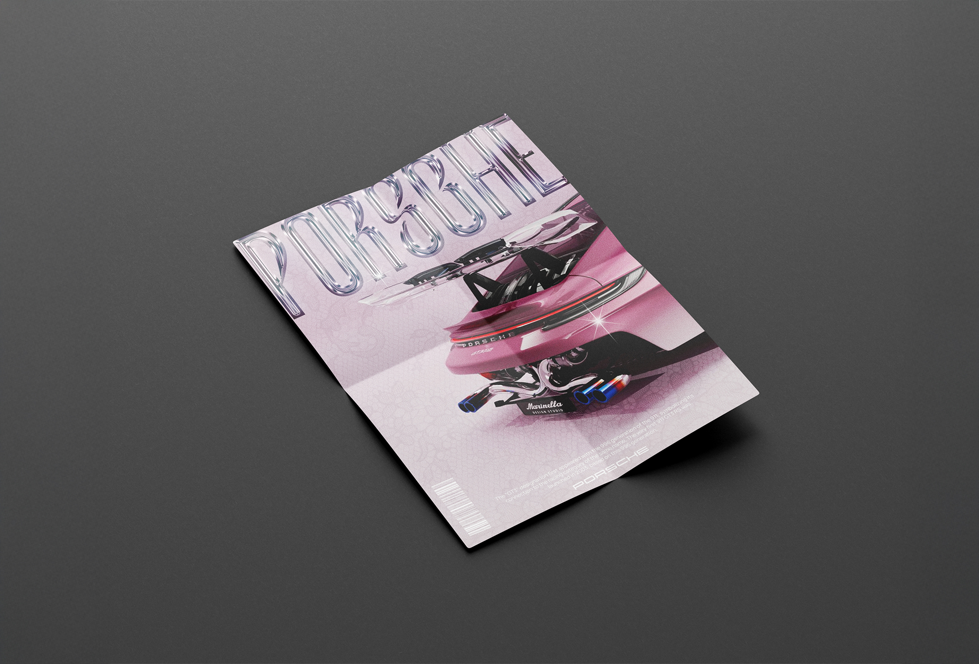 L'objectif principal de ce projet était de créer une affiche moderne pour mettre en valeur la légendaire Porsche GT3 RS. L'enjeu était de capturer sa puissance et son élégance à travers une typographie chrome brillant et des effets métallisés, accentuant ses courbes dynamiques et son allure iconique.