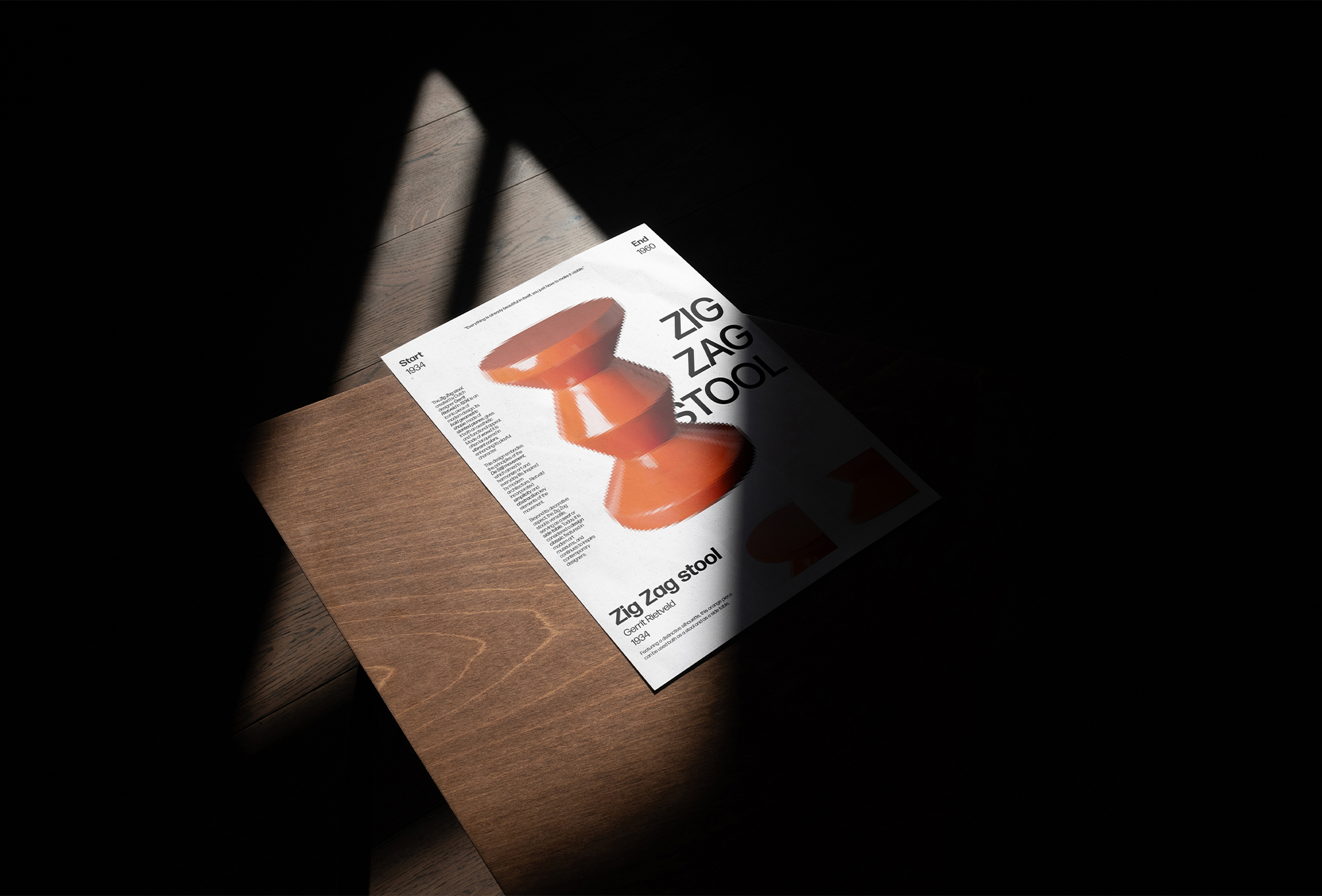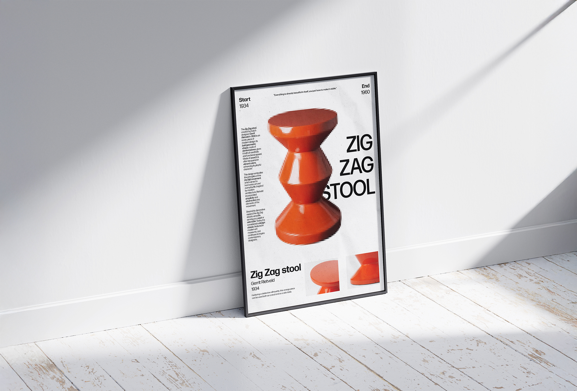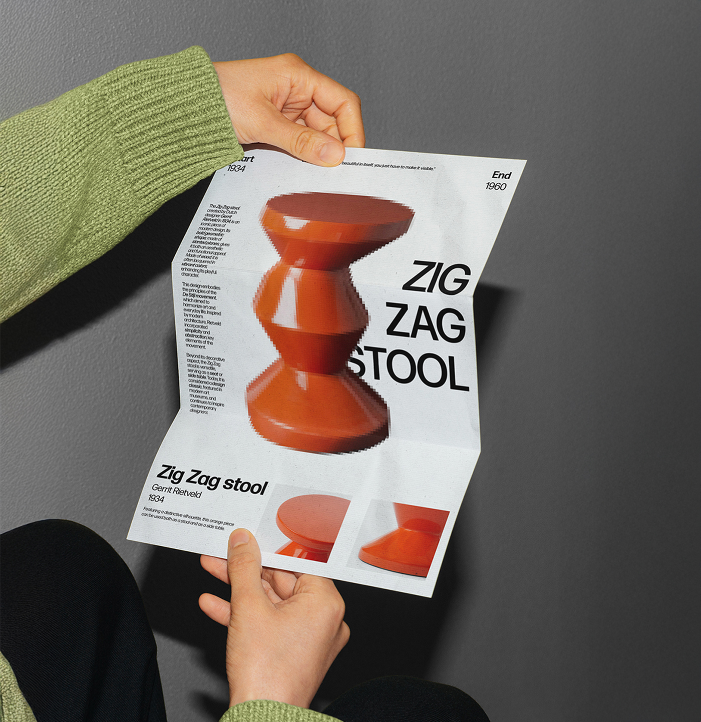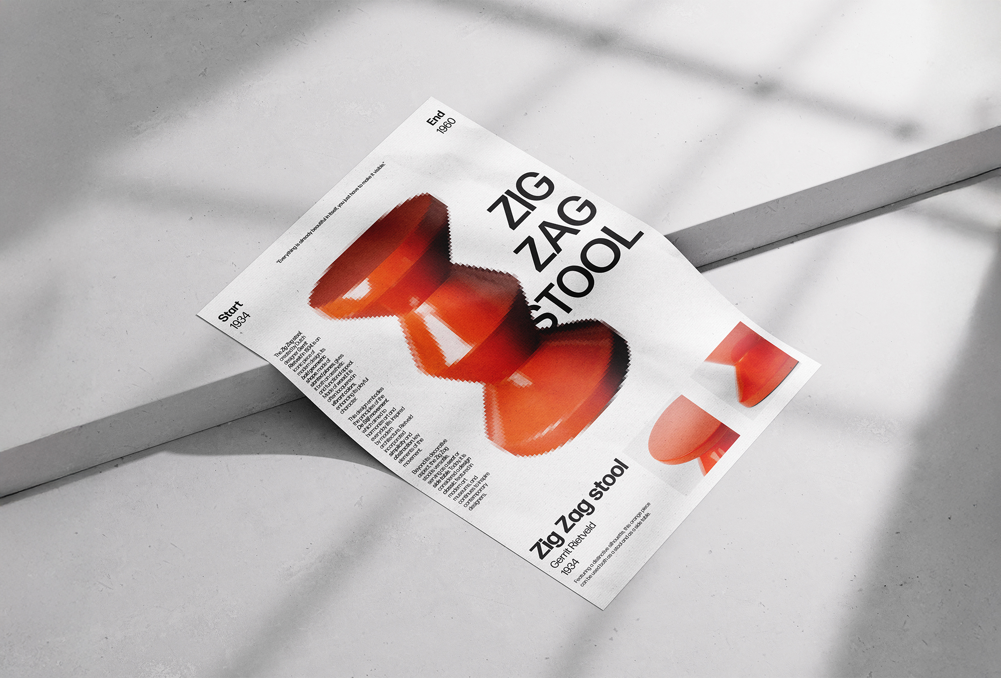 Ce projet visait à concevoir une affiche mettant en lumière le tabouret Zig Zag de Gerrit Rietveld, une icône des années 30. Le design exploite la géométrie caractéristique de cette pièce avec des lignes angulaires et un effet pixelisé, créant un visuel audacieux qui souligne son minimalisme et son dynamisme unique.
